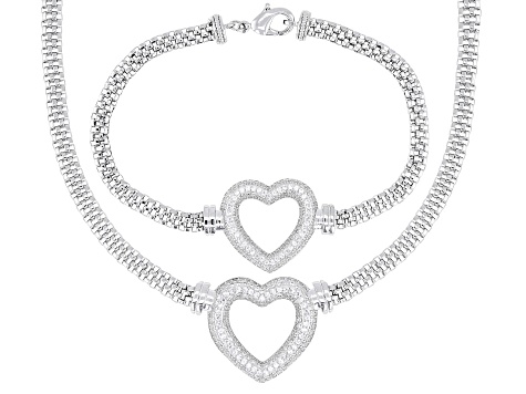 White Cubic Zirconia Rhodium Over Brass Heart Bracelet and Necklace Set 3.80ctw Related Video Thumbnail
